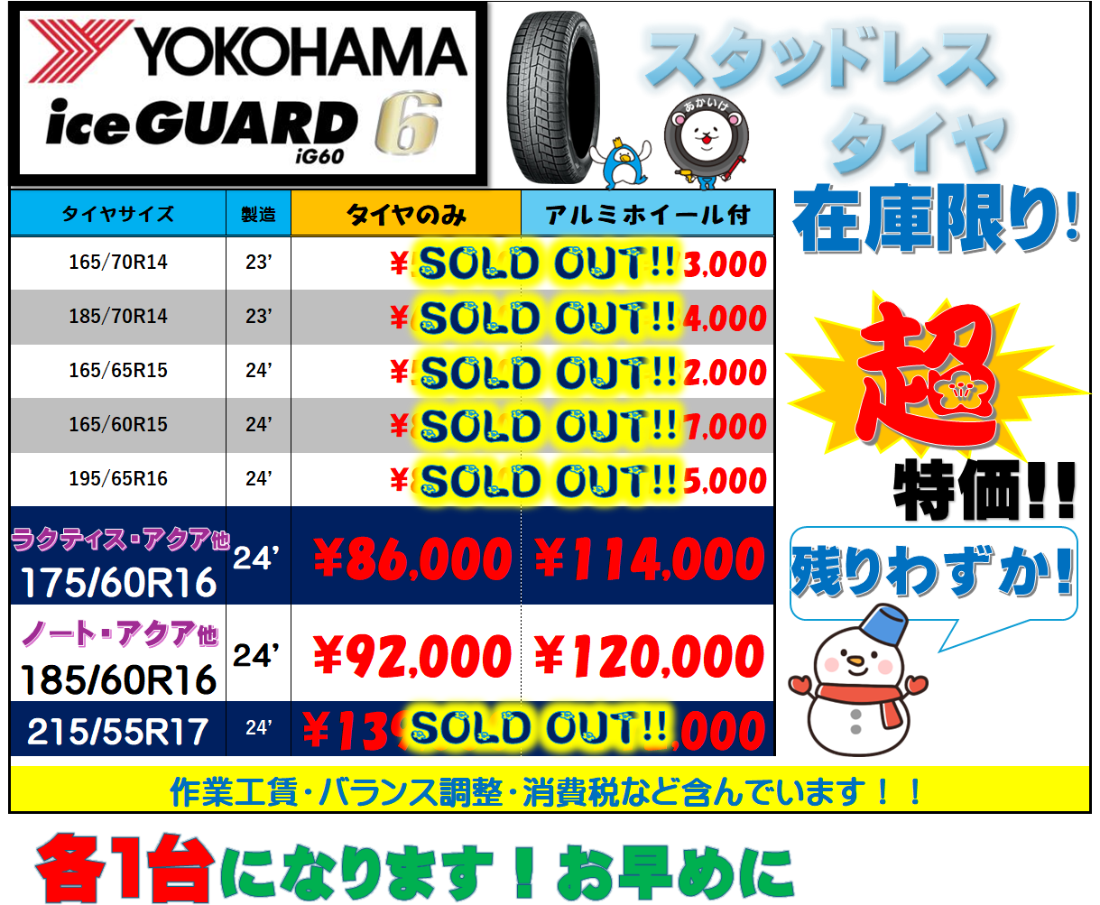 | 2026年01月11日 | ヨコハマ、アイスガード60+アルミホイール4本セットが、安い。 |